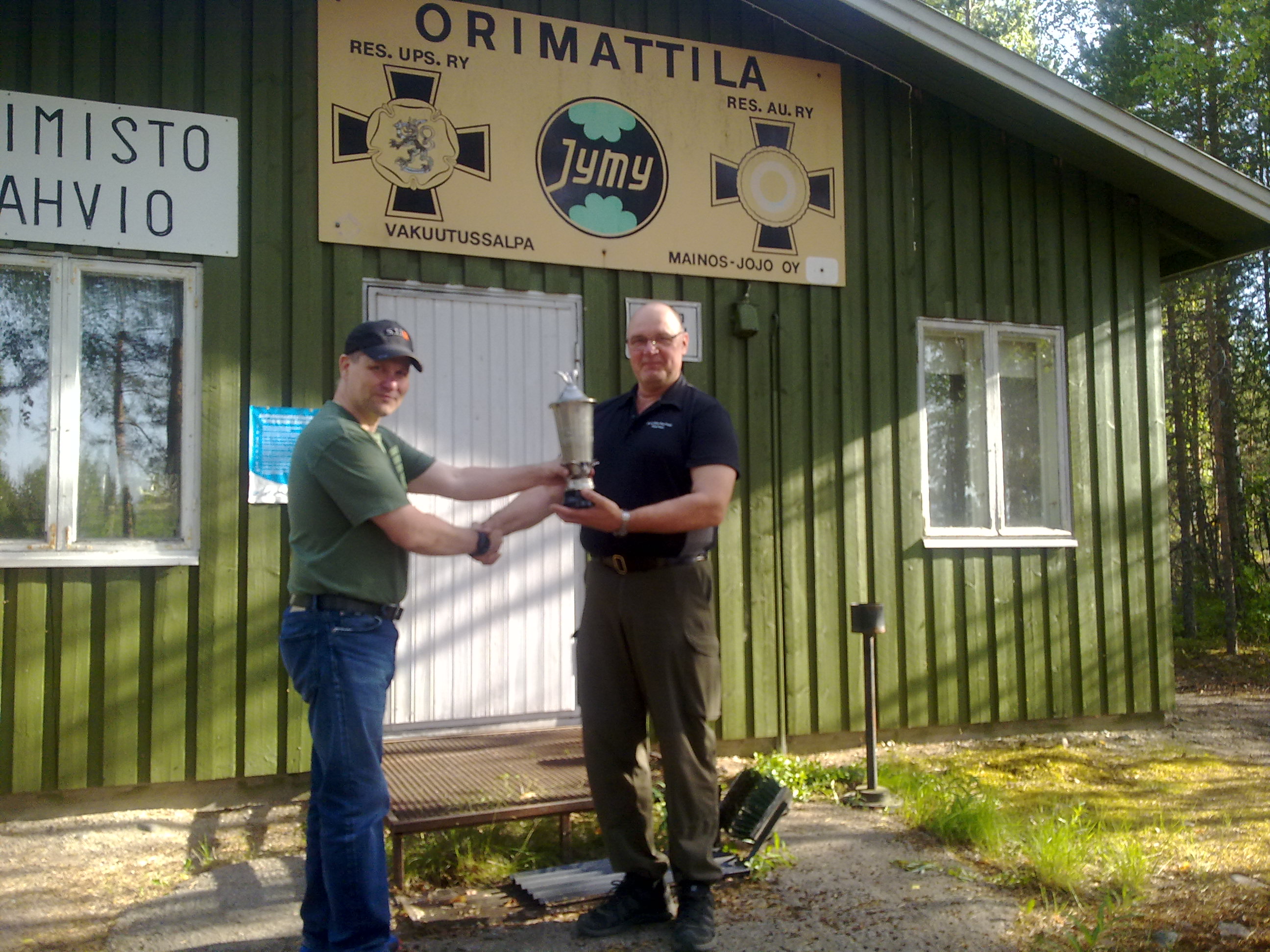 Ritarimaljakilpailu 14.6.2018. Marko Patrakka olentaa kiertopalkinnon voittajalle Arto Tapiomaalle