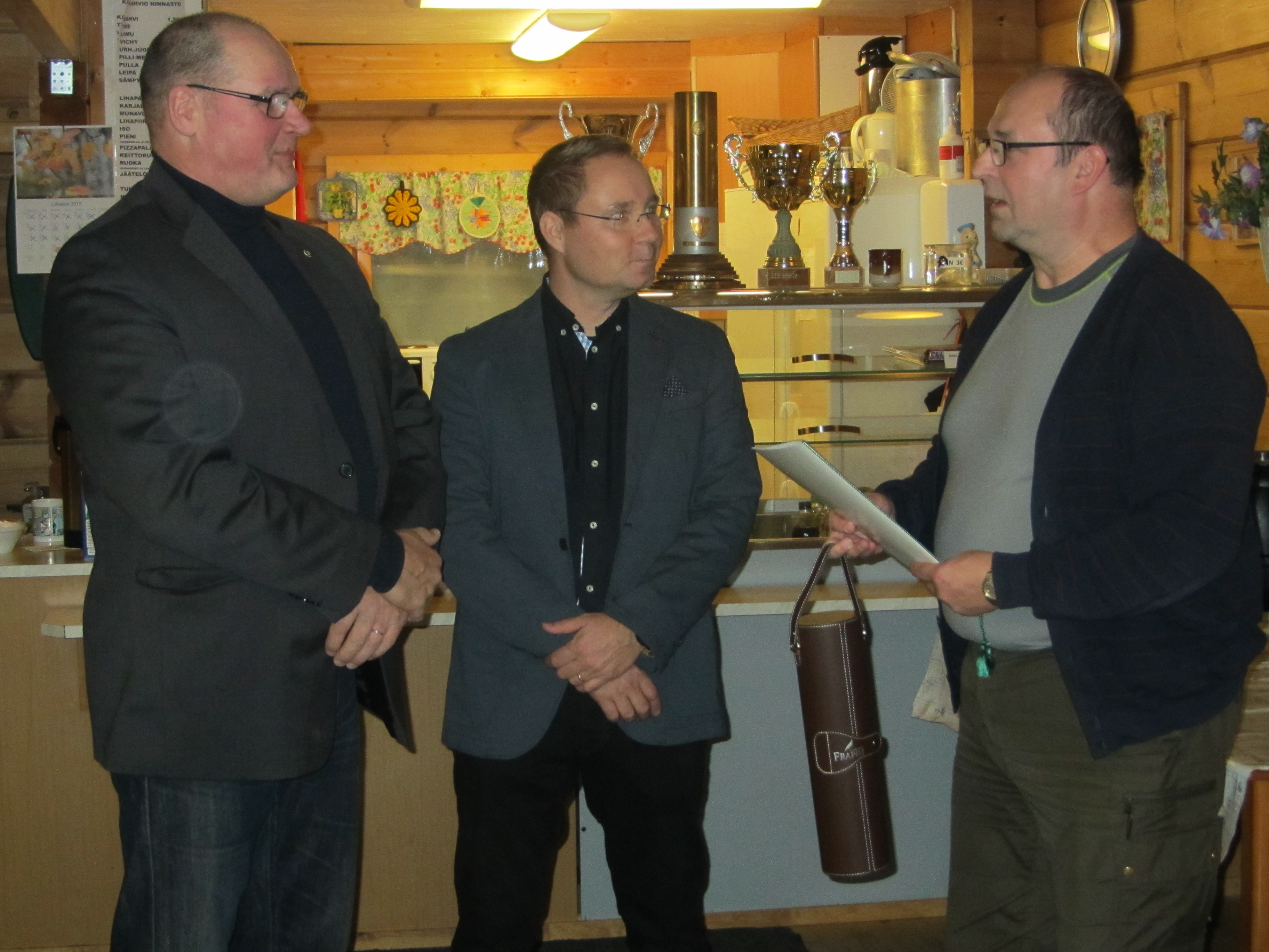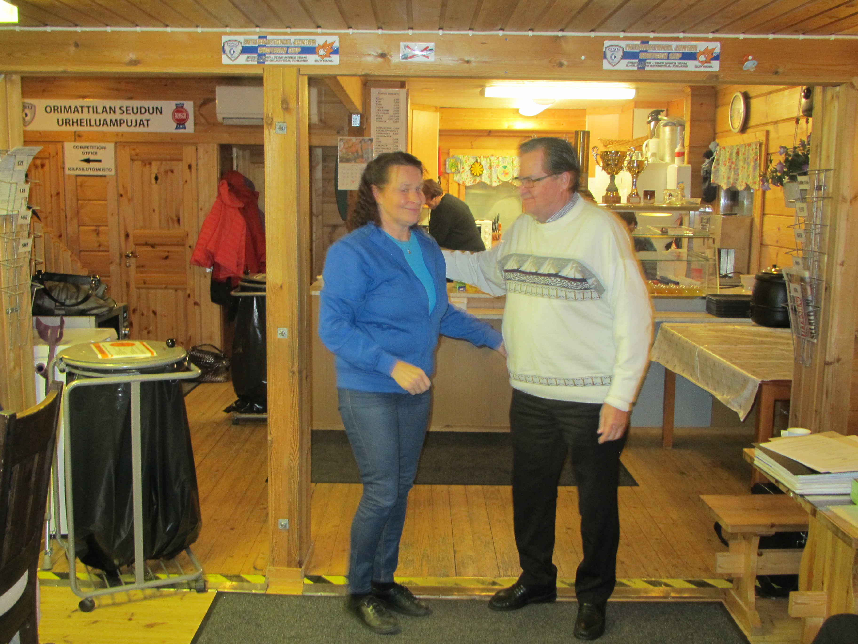 Matti-Juhani Vilo onnittelee Tarja Savilaaksoa piirin huomionosoituksesta